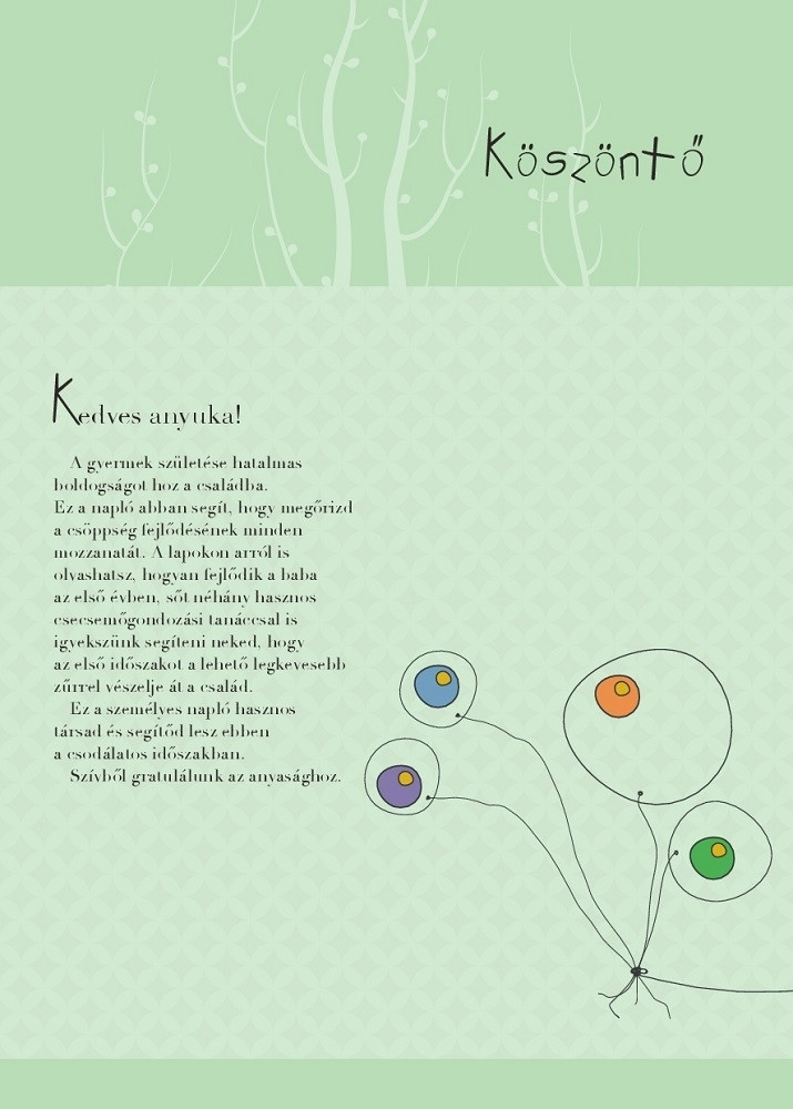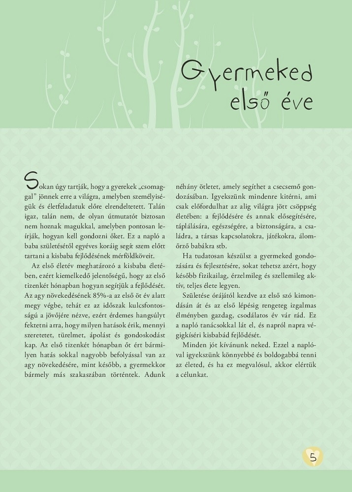 A gyermek születése hatalmas boldogságot hoz a családba. A napló segítségével megőrizheted a csöppség fejlődésének minden mozzanatát. A lapokon arról is olvashatsz, hogyan fejlődik a baba az első évben, sőt néhány hasznos csecsemőgondozási tanáccsal is igyekszünk segíteni Neked, hogy az első időszakot a lehető legkevesebb zűrrel vészelje át a család. Ez a személyes napló hasznos társad és segítőd lesz ebben a csodálatos időszakban.