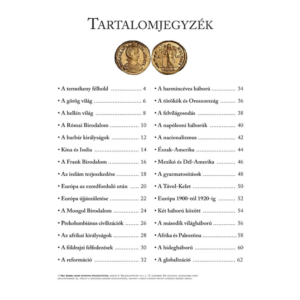 Azóta, hogy az első civilizációk létrejöttek Egyiptom és Mezopotámia folyóvölgyeiben, több mint hatezer év telt el. Ezalatt rengeteg minden történt az emberiséggel. Ismerjük meg a történelem fordulópontjait, száguldjunk át hatezer év históriáján, hogy megérthessük a múltunkat és megsejtsük a jövőt. Ebben a könyvben a történelmi események összefoglalása mellett részletes térképek és rengeteg kép segíti az ismerkedést a kor főszereplőivel és tetteikkel.