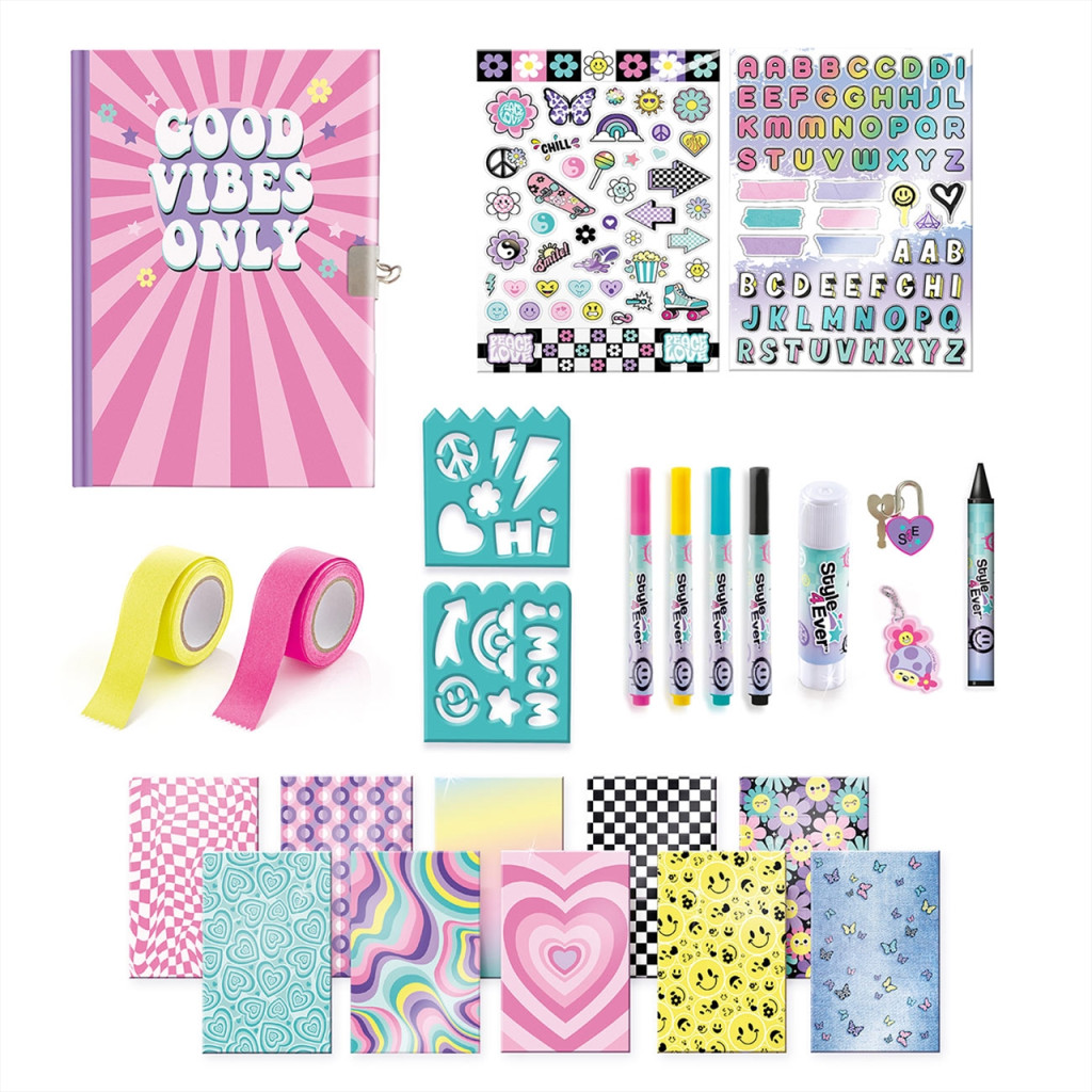 Itt az emlékkönyvek legújabb generációja! Ez a sima lapokból álló notesz nem holmi üres füzet. A csomagban mintegy 125 kiegészítő érkezik hozzá, amivel minden egyes lapját feldobhatod. Stencilek. Matricák két íven. Színespompás mintás lapok. Színes ragasztószalag. Filcek. Viasz toll. Ráadásul minden vagány csajos színekben! Ráadásul dobozban találsz egy medált, valamint egy szívecske formájú lakatot, amivel biztonságba rejtheted a titkos naplód tartalmát. Style 4 Ever kreatív szett a Canal Toys-tól, amit 6 éves kortól ajánlunk.