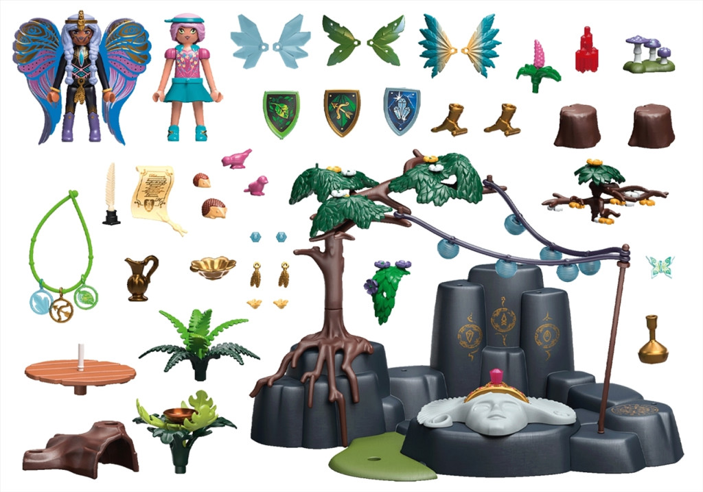A szett tartalma : 1 db Luyana sámántündér figura, 1 db Hildi tündér figura, 1 db szertartási helyszín, 1 db kő tündérfej beépített mágikus kristállyal és szimbólumokkal, 3-féle tündérszárny párban, 1 db oklevél, 1 db asztal, 1 db világító fényfüzér, erdei élőlények és sok-sok egyéb kiegészítő.