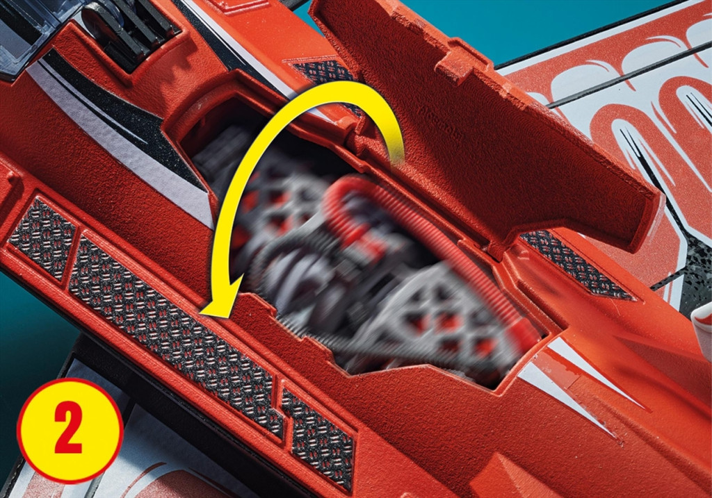 Menő "Sas" optikkal. Forgatható motortubinával a repülőgép törzsében, amelyet egy felhúzható motor hajt. Lerombolható oszlopokkal az izgalmas repülőgyakorlatok imitálásához.