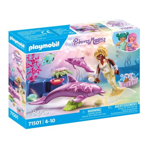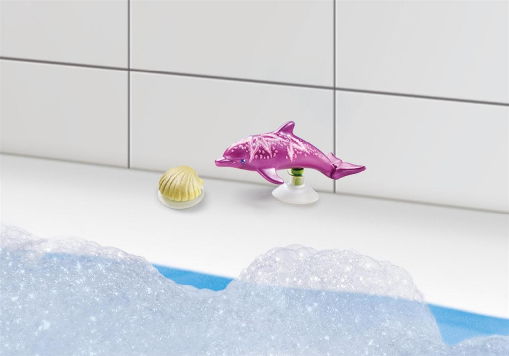 A sellő mindig örömmel gondoskodik a delfinmamáról és az utódokról. Bébidelfinnel és dekoratív kagylóval, amely a tapadókorongok segítségével rögzíthető sima felületekre.