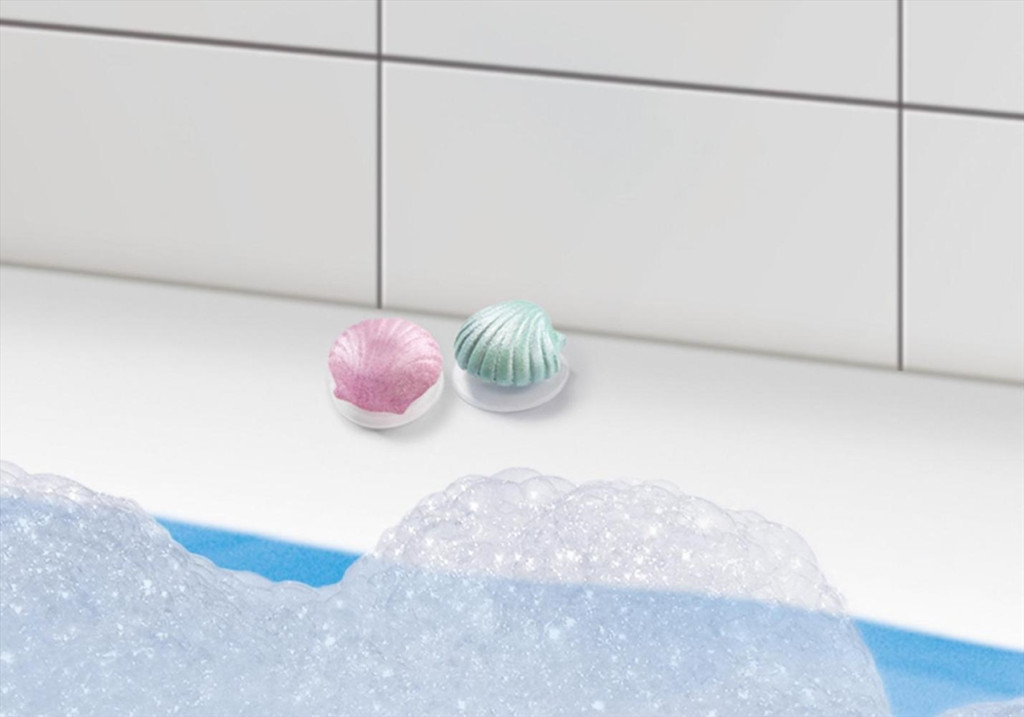A sellőgyerekek virágokat és kagylókat gyűjtenek, miközben a medúzákat figyelik. Két dekoratív kagylóval, amelyek a tapadókorongok segítségével rögzíthetők sima felületekre.