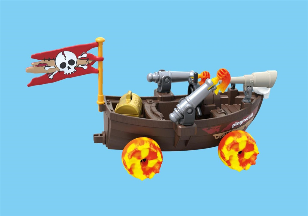 A PLAYMOBIL® 71720 Racing kalózhajó izgalmas fordulatot ad a klasszikus kalóztörténeteknek: ez a különleges jármű nemcsak a vízen, hanem négy tüzes keréken a szárazföldön is bevethető. A bátor kalózkapitány a fedélzetről kémleli a horizontot távcsövével, miközben a hajó két ágyúja készen áll a tengeri csatákra. A fedélzeten biztonságban lapul a kincsesláda arannyal, az orgonafejes díszítés és a zászló pedig igazi kalózhangulatot teremt.