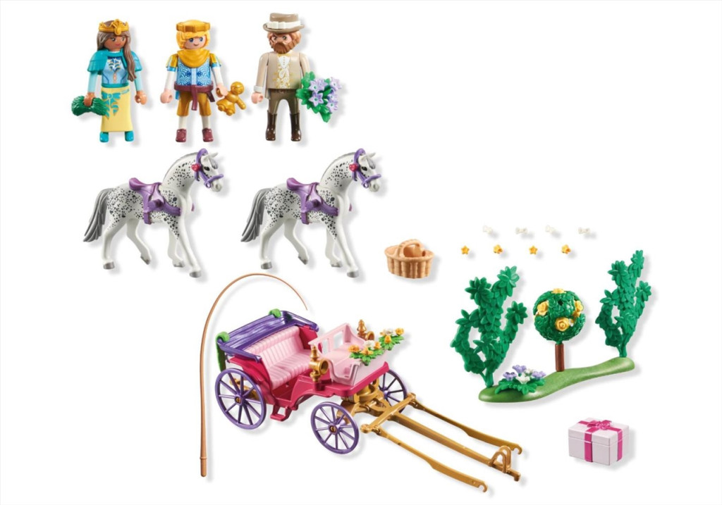 A Playmobil Kocsikázás lovashintón szettben a herceg és a hercegnő elegánsan helyet foglalnak a hintó hátsó ülésén, míg az inas biztos kézzel irányítja a két gyönyörű lovat. Indulás előtt a gyerekek szív alakú díszekkel és szalagokkal ékesíthetik a lovak hámját, hogy a romantikus menet még varázslatosabb legyen.