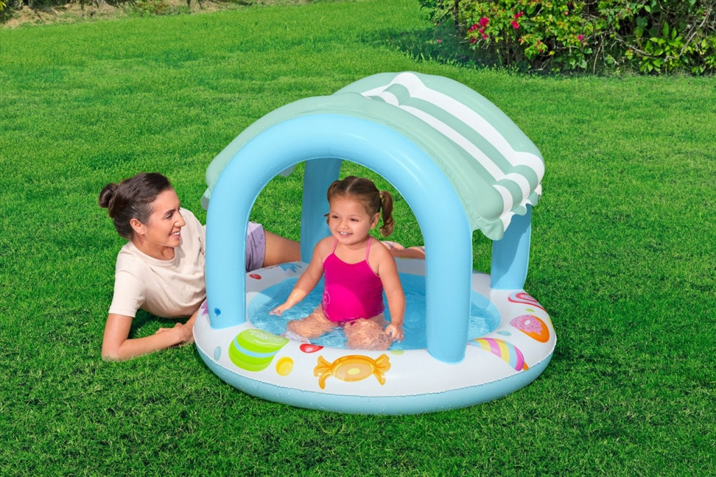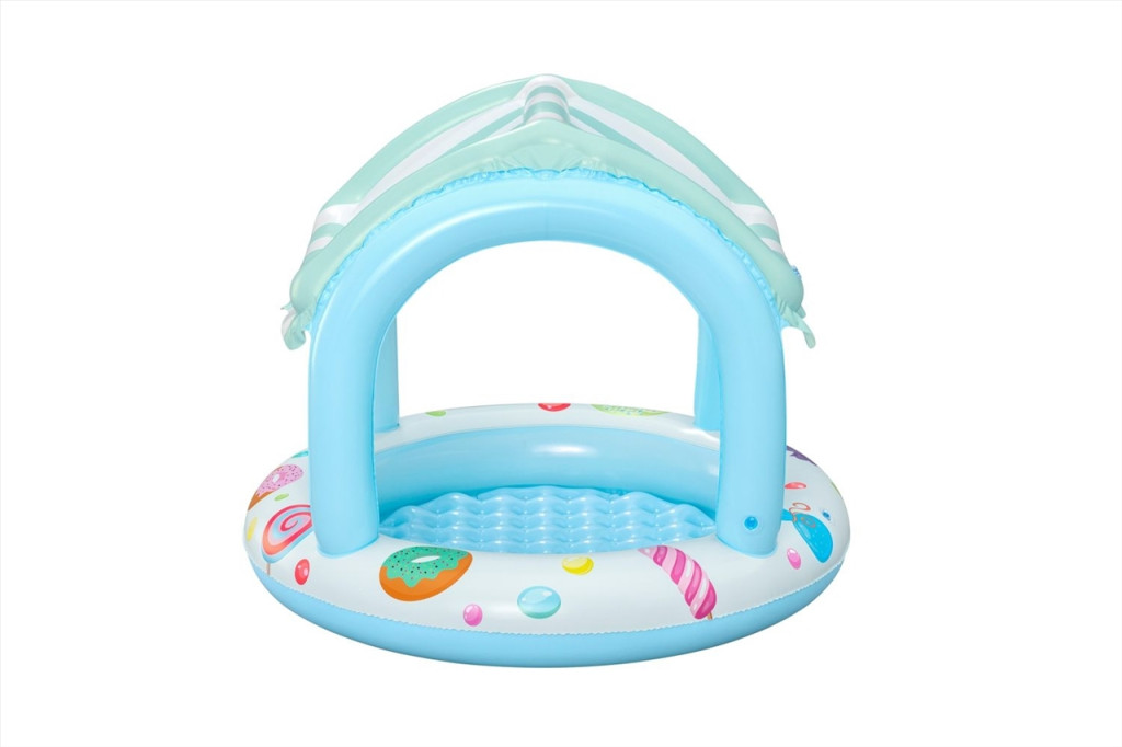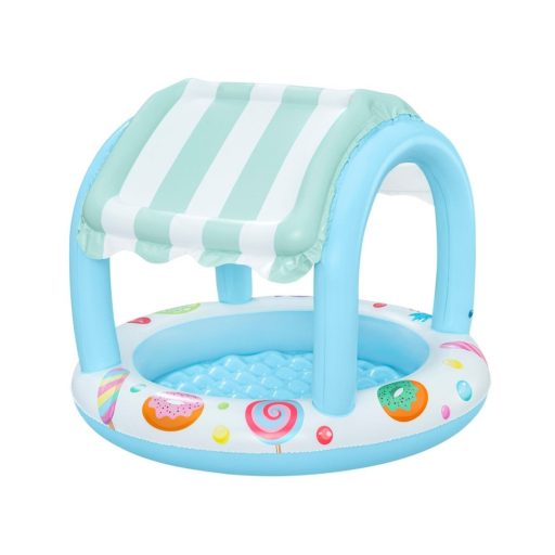 A Bestway Sweet Shoppe árnyékolt gyerekmedence egy színes, felfújható gyerekmedence, amely ideális választás 2 éves kortól. A beépített, felfújható tető védelmet nyújt a napfény ellen, míg a puha, felfújható alj kényelmes és biztonságos játékfelületet biztosít. A medence 34 liter víz befogadására képes, és könnyen felfújható légszelepekkel rendelkezik.