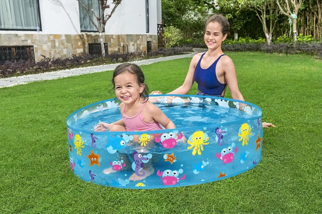 A Bestway Fill ‘N Fun merevfalú, vidám mintás gyerekmedence ideális választás a legkisebbek első vízi élményeihez. A 122 cm átmérőjű és 25 cm mély pancsolómedence tökéletes otthoni használatra a forró nyári napokon, és garantáltan mosolyt csal a gyerekek arcára.
