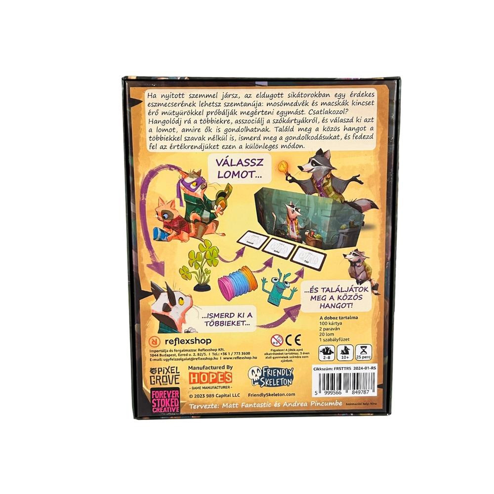 A társasjáték tartalma: 100 kétoldalas szókártya, 20 lom, 1 mosómedve paraván, 1 macska paraván