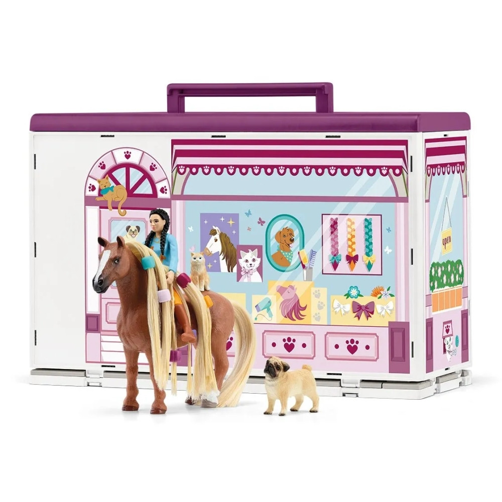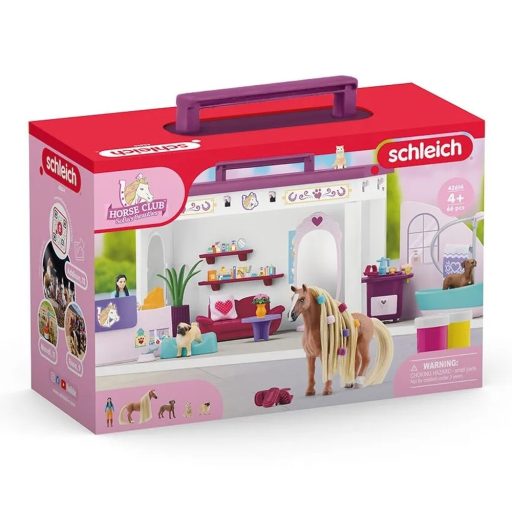A Schleich Sofia’s Beauties hordozható szépségszalon egy különleges játékszett, amelyben a lovak, kutyák és cicák teljes átalakuláson mehetnek keresztül. A részletgazdag szalonban vízzel lehet megmosni a ló sörényét, majd fésülni, fonni és csatokkal díszíteni. A speciális, lemosható festékekkel egyedi minták kerülhetnek a szőrzetre, amelyek a következő játék alkalmával egyszerűen eltávolíthatók, így mindig új stílus születhet. Amíg a ló szépül, a kutyusok és a cica kényelmesen várakoznak a szalonban. A hordozható kialakításnak köszönhetően a szépségszalon bárhová magaddal vihető.