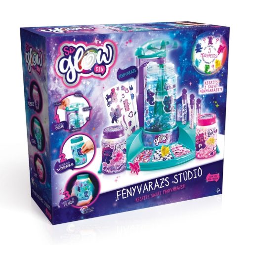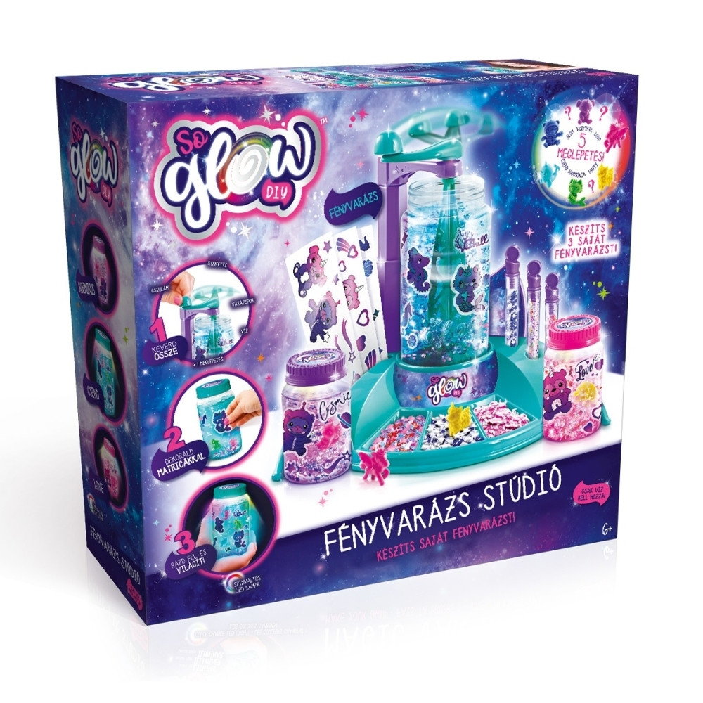Készíts saját, különleges, egyedi Fényvarázst a So Glow Fényvarázs stúdióval! Töltsd meg a nagy műanyag üvegcsét vízzel, helyezd be a keverőbe, önts bele egy csomag csillámot és két csomag konfettit. Bontsd ki a meglepetés figurákat, és helyezz el benne egy vagy több darabot. Már csak a varázsport kell hozzáadnod, a tetőt ráhelyezve jól összeráznod, hogy a Fényvarázs palackod elkészüljön!