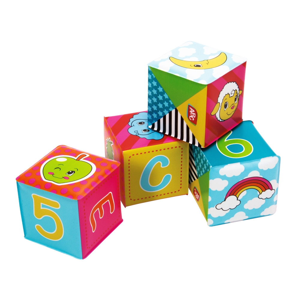 A 6 db puha kockák különböző témájú mintái az egyszerű összefüggések követése segítségével fejlesztik a picik megfigyelőképességét, miközben játékosan finomítják a szem- és kézkoordinációt.
