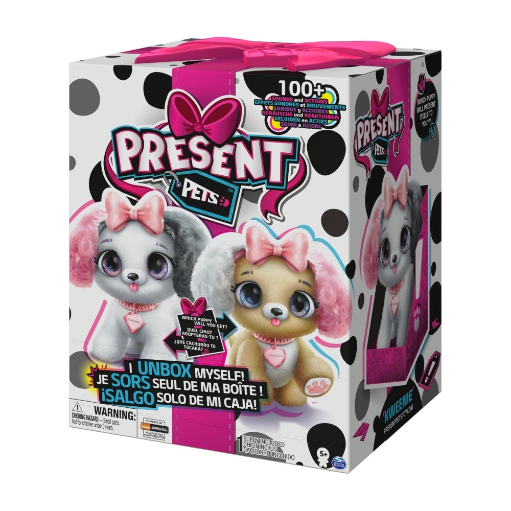 A több mint 100 hanggal és interakcióval rendelkező Present Pets életre kelti annak igazi boldogságát, milyen saját kiskutyát kapnil. A Present Pets kölyök kutyus nagyszerű ajándék az 5 éves és annál idősebb gyerekeknek, és minden ajándékozási alkalmat különlegessé tesznek.