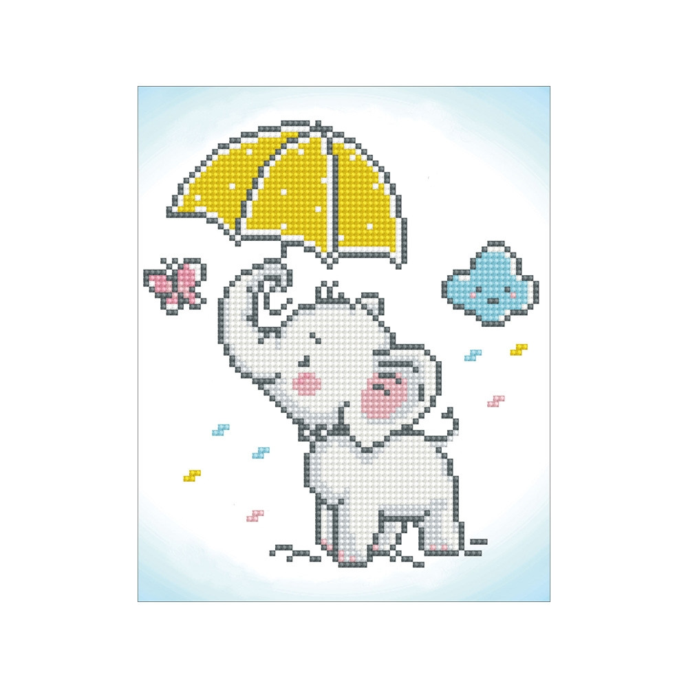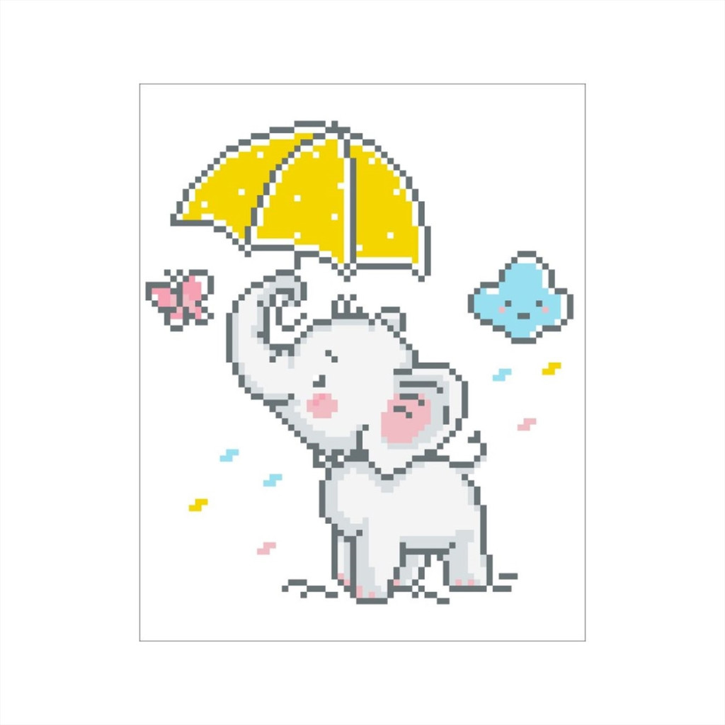 Ez a kép egy aranyos bébi elefántot ábrázol, aki egy sárga színű esernyőt tart az ormányával, oldalt pedig egy pillangó és egy felhő teszi vidámabbá a képet. A kép mérete 20 x 25 cm, a képet egyszerűen ki lehet rakni így ez egy kezdő csomag szett.