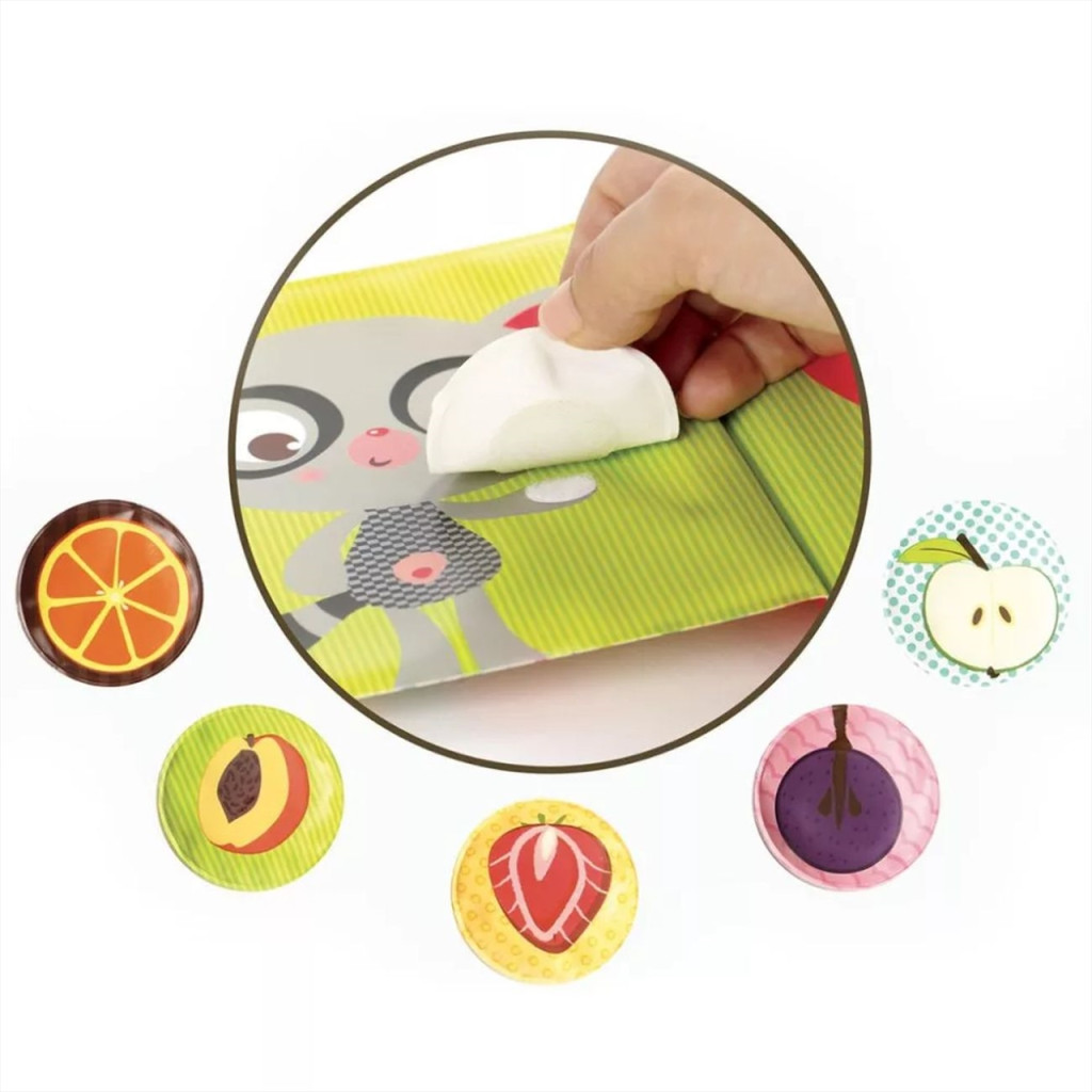 Gyermekünk a könyv segítségével, megismerheti az állatokat és azok kedvenc gyümölcsét. Nem csak színpompás, de még illatos is. A könyvhöz tartozó kis gyümölcsszeleteket ábrázoló korongok megdörzsölve illatosak. Ezeket a korongokat tépőzár segítségével az adott állathoz tudjuk párosítani.