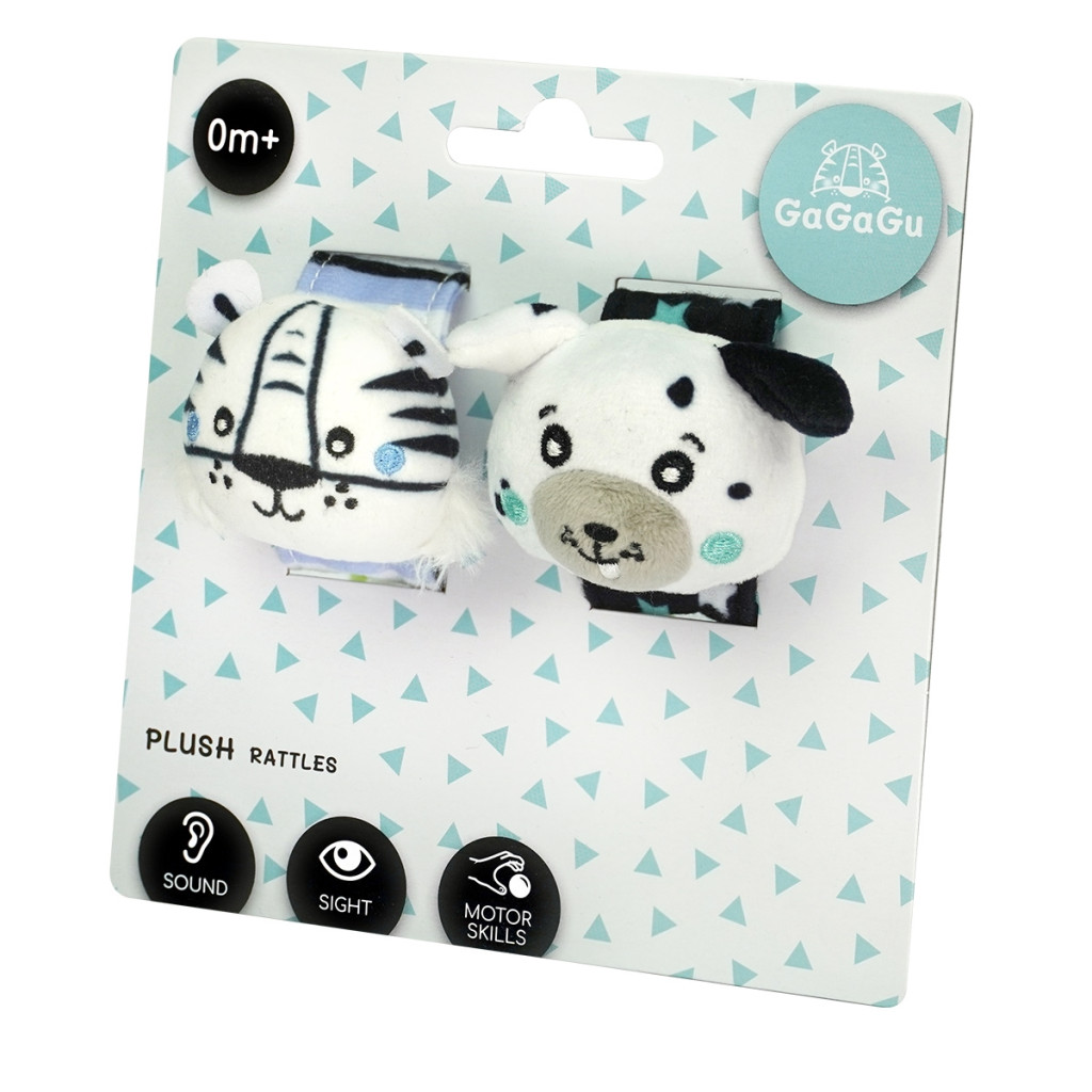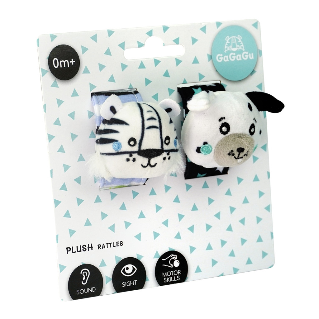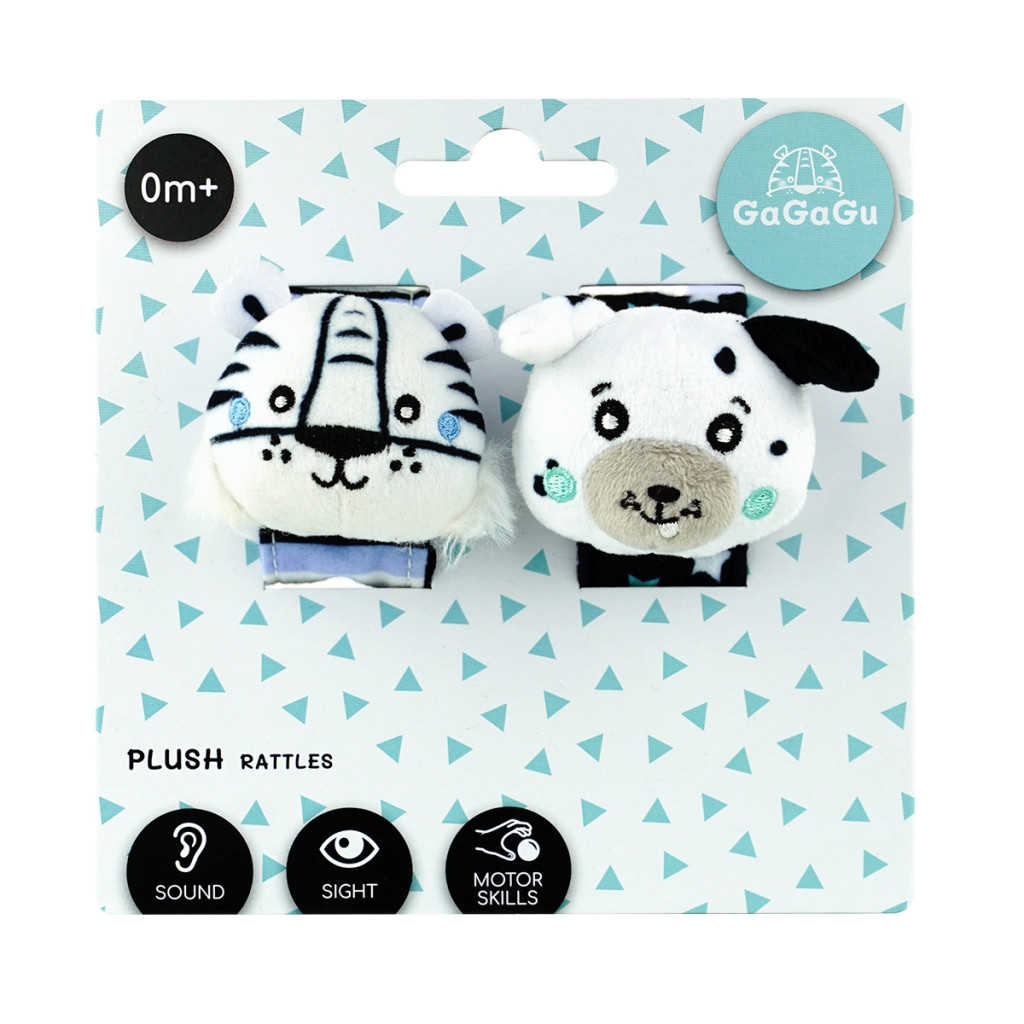 A GaGaGu csörgő aktivizálja a hallás érzékszervét – a csörgő hangja lágy és kellemes (nem túl hangos). A csörgő kontrasztos színű és mintázatú, ami serkenti a csecsemő látását. Az állatok – kis tigris és kutyus – plüss feje kedvet csinál a gyermeknek a megragadására, és támogatja az ún. finom motorika gyakorlását (az ujjak és a tenyér mozgatása) és a mozgáskoordináció tanulását. A csörgő a csuklóra csatolható (egy speciális, éles szálak nélküli, könnyen zárható tépőzárral), de használható közönséges csörgőként is, mivel a pánt puha anyagból készült, és nem akadályozza a gyermeket az egész játék kényelmes megragadásában. A játék nagyon könnyű és kézreálló, könnyen tárolható, ideális arra, hogy magunkkal vigyük egy sétára vagy utazásra. 0+ hónapos kortól alkalmas a gyermekeknek, és egyike a GaGaGu márkanév alatt kapható 12 terméknek. A csörgőkön kívül kaphatóak susogók, spirál, függők, könyvek, valamint szenzorikus kockák és szőnyeg.