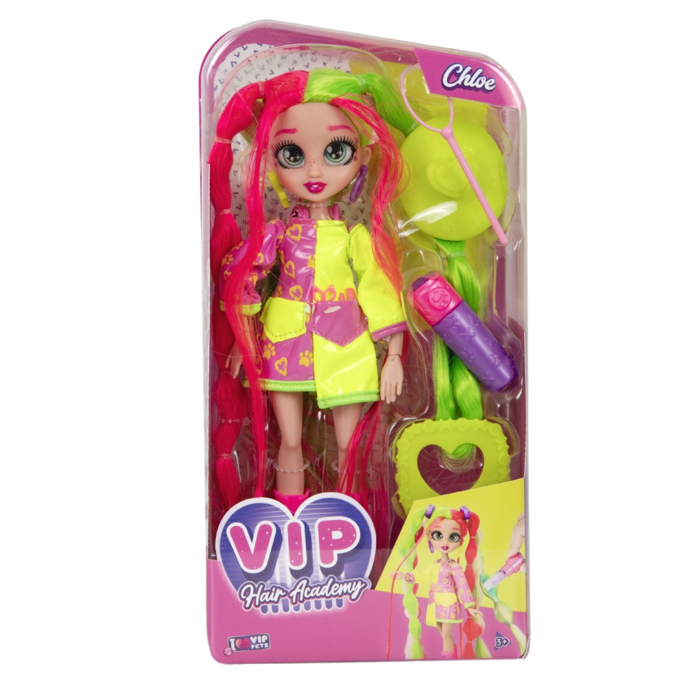 Vip Hair Academy, amelyet VIP Girls-ként is ismernek, egy divatos és stílusos babasorozat azok számára, akik szórakoztatónak tartják a divatot és a frizurakészítést. Chloe gyönyörű, háromszínű hajjal rendelkezik, és egy olyan kettős színű ruhában jár, amelynek zsebeiben fodrászeszközöket tart.  A Chloe haját speciális vízfelhordó eszköz segítségével lehet formázni, aminek hatására megváltozik a haj színe. Hajgumikat vagy hajcsatokat is használhatsz. A sorozatot négy 24 centiméter magas baba alkotja, mindegyikük mesés és színes, szemet gyönyörködtető ruhát visel. Hosszú, színes, akár 30 cm hosszú hajukkal, imádnivaló arcvonásaikkal és nagy üvegszemeikkel a Vip Girls kedvenc háziállatainkra - a Vip Pets-re hasonlítanak! A Vip Hair Academy babákkal játszani nemcsak divatos móka, hanem igazi frizuraőrület is. Minden készlet számos kiegészítőt, például hajkefét, speciális hajformázó eszközt (ami minden babánál más), hajcsatokat, hajgumikat és ékszereket tartalmaz. Érezd magad pompásan, fésülj és pózolj, mint egy igazi VIP!  Életkor: 3+.  A csomagolás tartalma: baba + 6 kiegészítő.