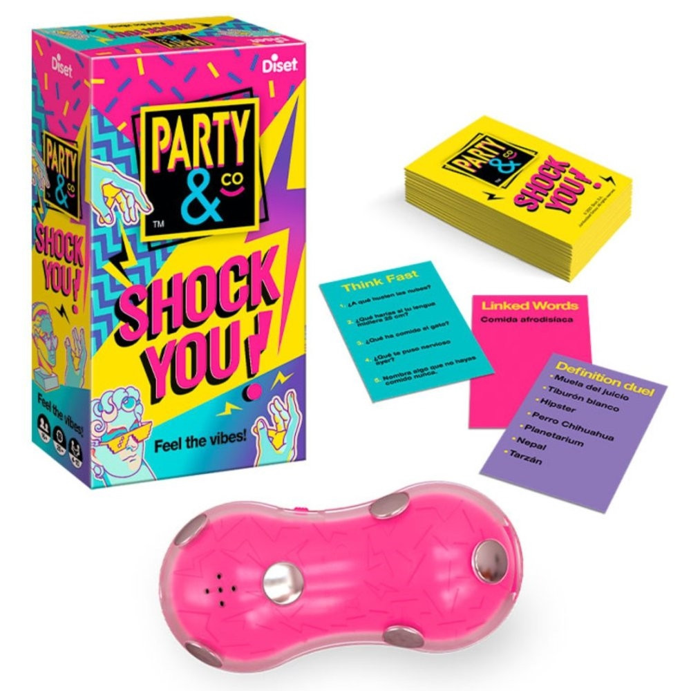 Szórakoztató, stresszes, meglepő és dinamikus... az új Party &Co. Shock You! A játék 3 különböző kihívást és véletlenszerű időt tartalmaz. A cél a feladatok teljesítése, mielőtt az lejár az idő, és bekövetkezik a sokkolás. Három különböző szint állítható be: nincs impulzus, kis impulzus, közepes erősségű impulzus.